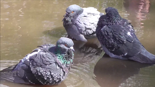 Голуби купаются в луже