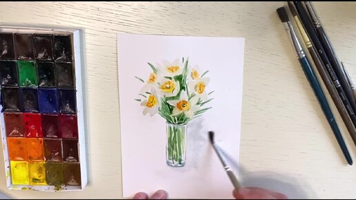 Нарциссы в вазе. Поэтапный рисунок акварелью