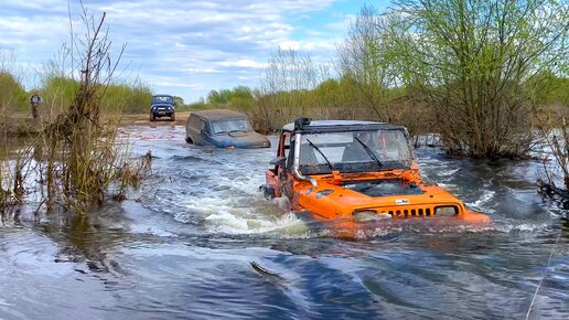 НИВУ СТАЛО УНОСИТЬ течением хорошо, что привязали к JEEP. Джип плывет, а в грязи стоит