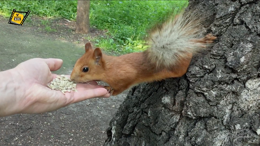 Далее: Дикая белка. Гладим ее. Она берет и грызет орешки с ладони.