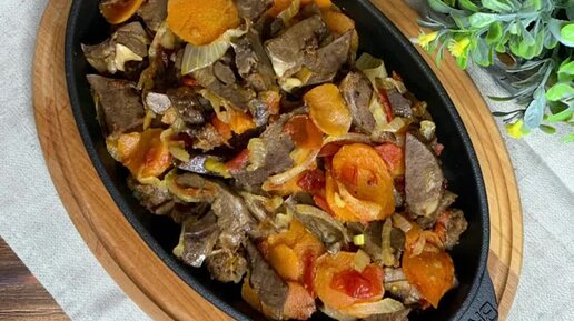 Свиное сердце с луком и морковью на сковороде