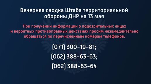 Вечерняя сводка штаба территориальной обороны ДНР на 13 мая 2022 года