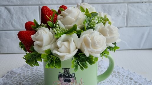 Сборка букета из мыльных роз и клубники в керамической кружке из FixPrise