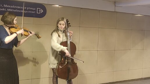 СПб. Санкт-Петербург. Выступление с кавер версией Трио в подземном переходе, скрипка и виолончель.