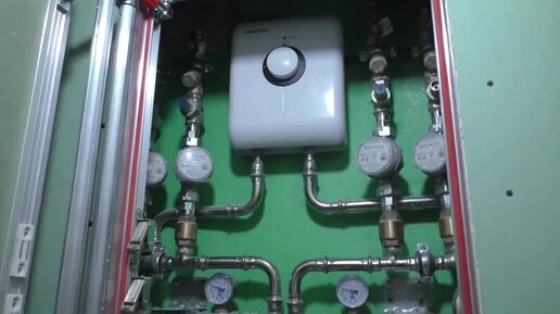 Инженерная сантехника. 2 стояка ГВС + 2 стояка ХВС и проточный нагреватель в резерве.