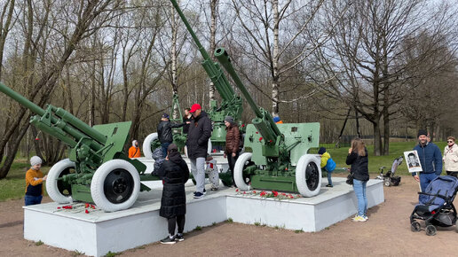 Артиллерийское трио – знаменитые Петергофские пушки в составе Приморского мемориального комплекса в День Победы, 9 мая 2022 года