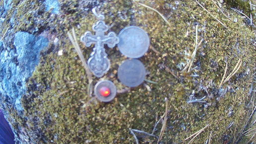 Поиск с металлоискателем нашёл 2 старинных монеты серебряный крестик и значок.