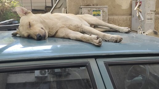 Собака разлеглась на крыше машины и спит и ей никто не мешает. Такое увидишь только в Египте))