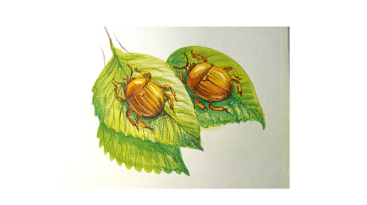 Золотые жуки на зеленых листочках - рисунок гуашью и цветными карандашами.