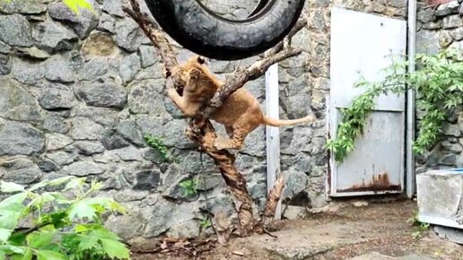 Неуклюжий львёнок на дереве