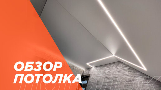 Матовый натяжной потолок со световыми линиями на мансарде и нишей Flexy со светильниками спотами