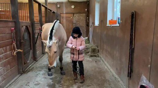 Маленькая девочка ухаживает за своей лошадкой!