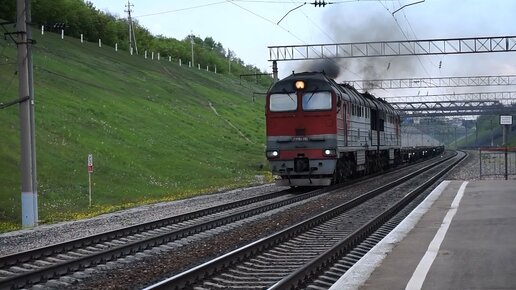 Тепловоз 2ТЭ116У-0169 с составом из фитинговых платформ и чёрными "медведями".