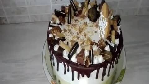 Торт на день рождения с шоколадными подтеками на белковом креме. Торт с бутылочкой
