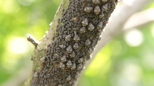 Кровяная тля на персике. На видео видно, как насекомые выделяют сладкое "молочко", то самое, которое так любят муравьи.