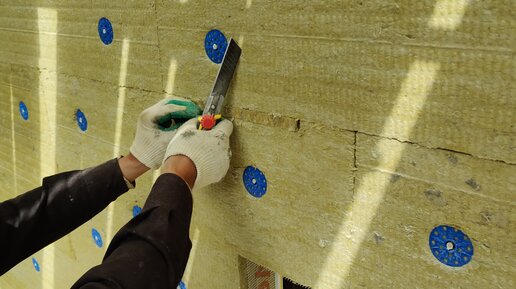 Зачеканивание полосками минваты сколов краёв листов и щелей, получившихся при её приклейке на фасад дома, СФТК Мокрый Фасад