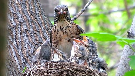 Дрозд кормит птенцов