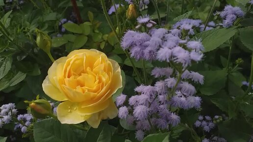 Агератум Голубая Норка и роза Грэхем Томас - гармония!