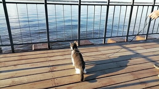 Первая реакция домашней кошки на волны большой реки. Кошка в первый раз видит большой водоем, до этого только ванна была).
