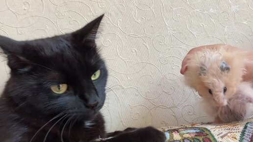 Сирийский хомяк Лайк и чёрный кот Сэм. Вот такие сожители 🤣