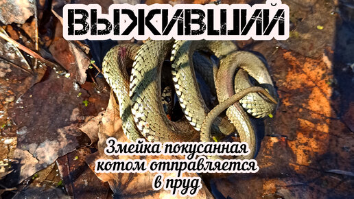 Выживший! Ужик потрёпанный котиком отправляется в пруд!