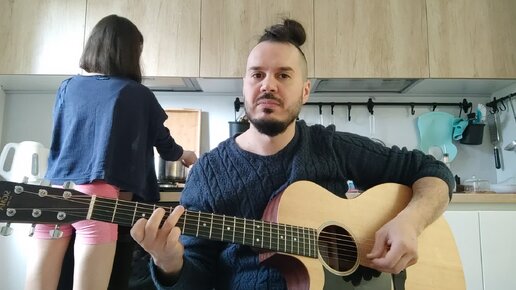 Проводим с женой время на кухне с пользой (я играю на гитаре, а жена готовит обед и поёт нашу песню о сыне)