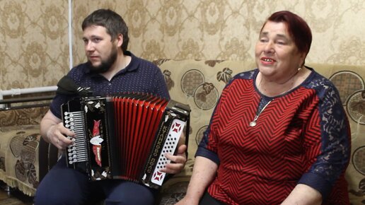 Бабушка с внуком исполняют песню "Виновата ли я" под гармонь.