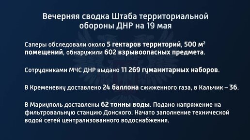 Вечерняя сводка штаба территориальной обороны ДНР на 19 мая 2022 года