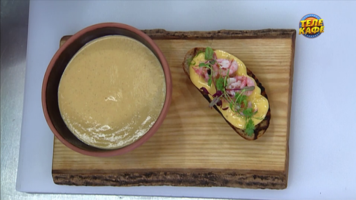 Креветочный крем-суп с тыквой, имбирём и тостом с масляным соусом