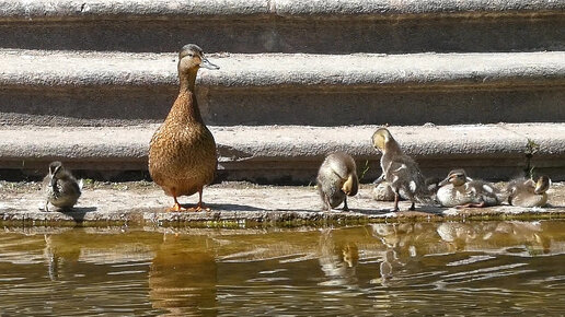 Утиное семейство греется на ступеньках у Скрипучей беседки и весело барахтается в пруду. Екатерининский парк.
