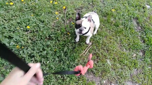 Французский бульдог Тэя играет с канатом. Азартный бульдог.