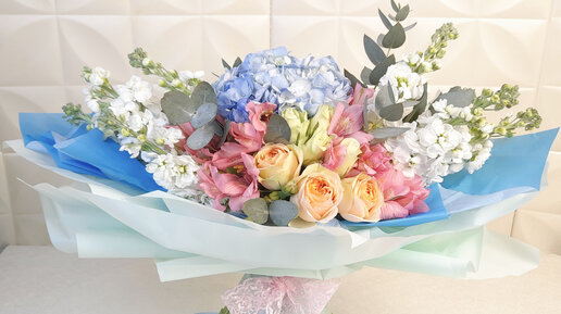 Собираем букет овальной формы с нежным сочетанием цветов белых, голубых и розовых оттенков.