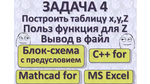 #4 Блок-схема с предусловием, Программы С++ for, Mathcad for, EXCEL Таблица x,y,Z Польз функция, вывод в файл
