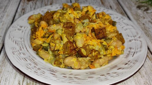 Салат С ФАСОЛЬЮ, СУХАРИКАМИ и маринованным ОГУРЦАМИ.