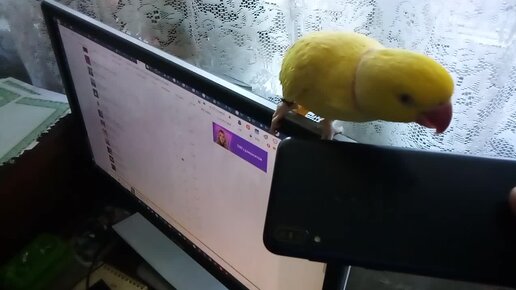 Яшка любит телефоны. Попугай Яшка любит и сниматься и грызть телефоны.
