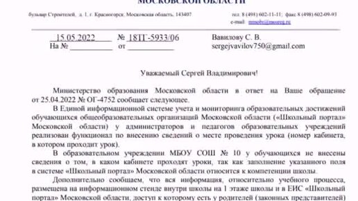 Дело о киднеппинге. Ответ Министерства образования МО (МОМО) о кабинетах в школьном расписании.