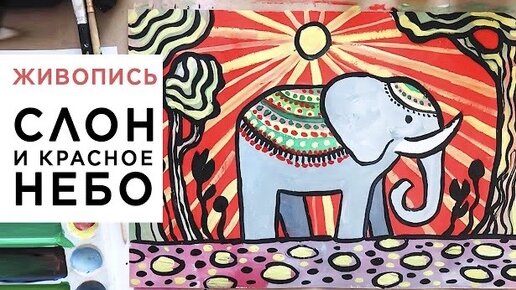 Как нарисовать слона гуашью на фоне красного неба и солнца. Урок для детей и взрослых.