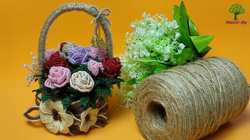 Цветы из бисера Параллельное плетение Розы из бисера в корзинке из джута Мастер класс\Master diy