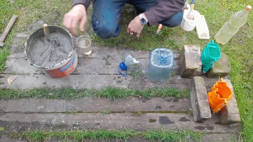 Заливаю стяжку для пола в пластиковую бутылку и в игрушки из фикс прайса. Не знаю что получится. 1 Часть