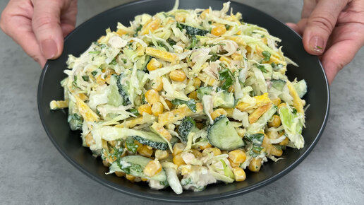 Салат из молодой капусты, которая выручает всегда: сочный, свежий салат на скорую руку с яичными блинчиками