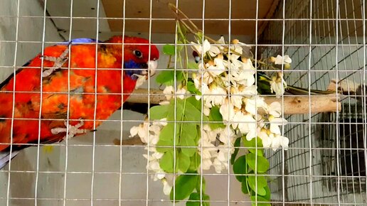 Кормим попугаев цветами белай акации.Канарейки пробуют новое лакомство .