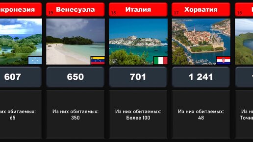 Сравнение стран по количеству островов и сколько из них обитаемы.