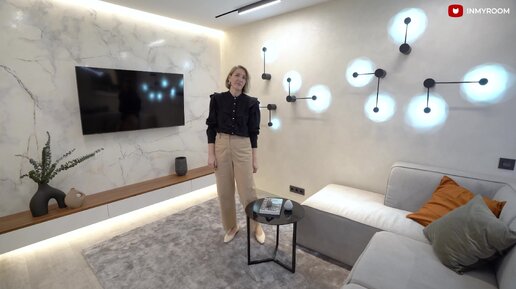 Нестандартные дизайнерские приемы в сочетании с обычными рейками помогли создать стильный современный интерьер гостиной