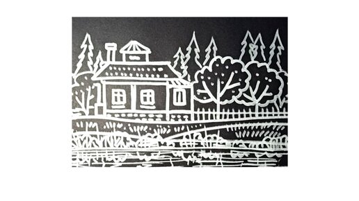 Домик у реки. Рисунок маркером металлик на черной бумаге.