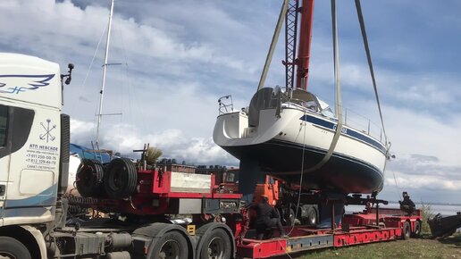 Грузим яхту на тягач, уходит из Кронштадта в Сочи. Ну да, там теплее...