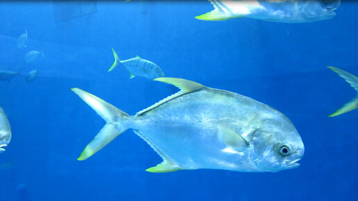Помпано: морские рыбы плавают рядом с вами и вокруг вас. Эффект погружения в морскую пучину. Приморский океанариум, Владивосток