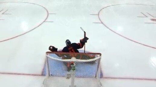 Вратарь "Эдмонтона" Смит пропускает шайбу, брошенную с чужой половины площадки, в четвертом матче серии с "Калгари".
