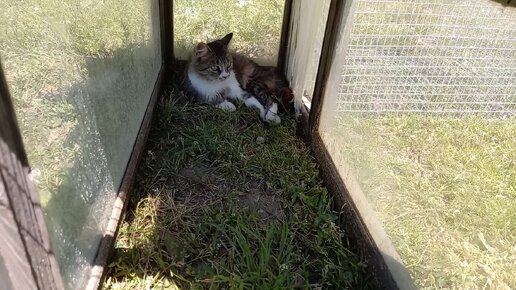 Переселяю утят на улицу.Реакция кошки на птицу.