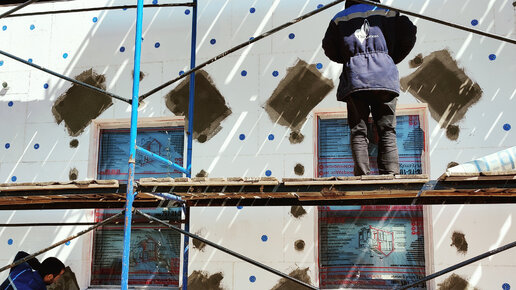 СФТК Мокрый Фасад, утепление пенопластом, базовый армирующий слой. Диагональные косынки клей с сеткой на углах оконных проёмов