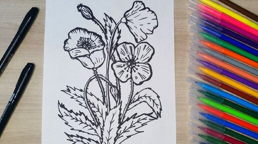 Как нарисовать маки. Легкий рисунок черным маркером. Пошагово